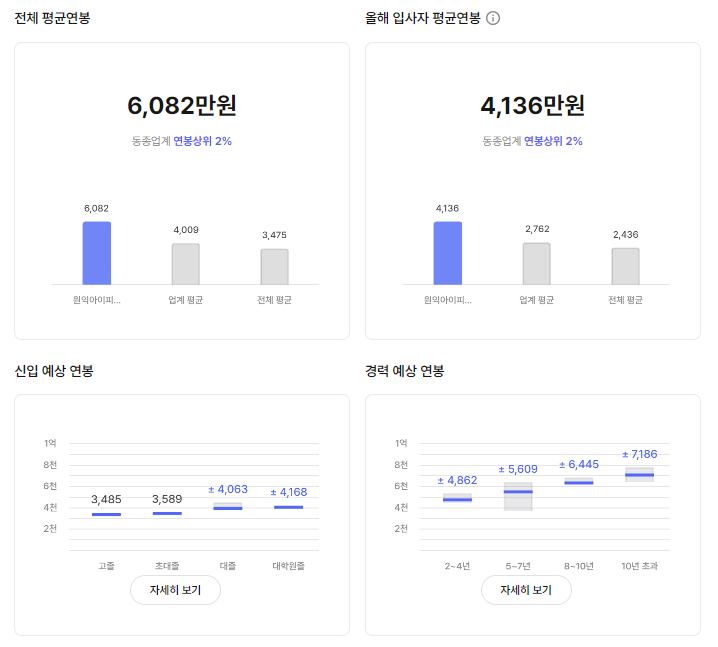 전체 평균 연봉(원티드 기준 평균 연봉 6,082만원, 블라인드 기준 5,068만원, R&D 직군 5,170만원)