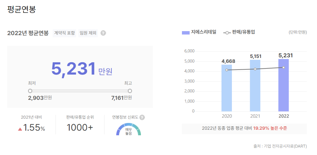 (주)지에스리테일연봉정보 - 평균연봉 : 5231만원 , 업종 : 체인화 편의점, 연봉상승률 : 1.55 상승(2021년 대비) | 연령별 연봉, 경력과 직무에 따른 예상 연봉과 월수령액을 확인해보세요.
