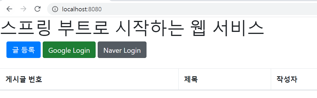 ... <div class="col-md-12"> <!--로그인 기능 영역--> <div class="row"> <div class="col-md-6"> <a href="/posts/save" role="button" class="btn btn-primary">글 등록</a> {{#userName}} Logged in as : <span id="user">{{username}}</span> <a href="/logout" class="btn btn-info active" role="button">Logout</a> {{/userName}} {{^userName}} <a href="/oauth2/authorization/google" class="btn btn-success active" role="button">Google Login</a> <a href="/oauth2/authorization/naver" class="btn btn-secondary active" role="button">Naver Login</a> {{/userName}} </div> </div> </div> ...