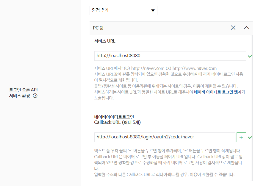 - AWS 서버에 배포하게 되면 localhost 외에 추가로 주소를 추가해야하며, 이건 이후 단계에서 진행하겠습니다.
